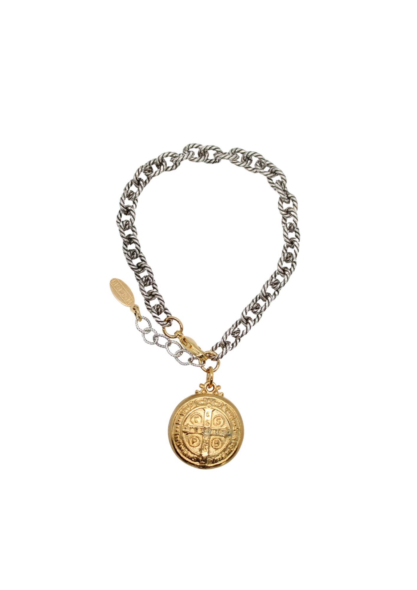 Una pieza de devoción y estilo. Con el icónico medallón de San Benito, esta pulsera es un símbolo de protección y fe. Fabricada con materiales de calidad y con un diseño clásico, es perfecta para llevar todos los días como recordatorio de tu fe y cómo accesorio elegante que complementa cualquier atuendo.